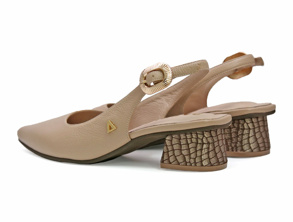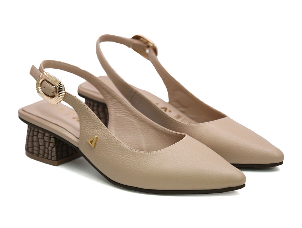 Zapatilla destalonada en cuero con punta fina que estiliza el pie, Posee correa ajustable y hebilla metálica garantizando un ajuste cómodo y seguro. Su tacón ancho con acabado en folia, aporta un detalle moderno sin perder la sofisticación. Hecho por manos colombianas. |