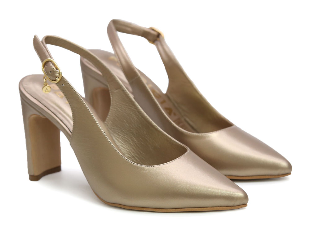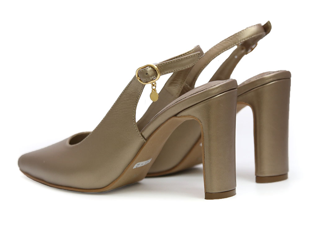 Zapatilla destalonada en cuero, color dorado mate. Su diseño clásico presenta una punta fina y un tacón grueso que aporta estabilidad y estilo. Forro interno, correa ajustable y plantilla acolchada para mayor confort. Hecho por manos colombianas. |