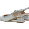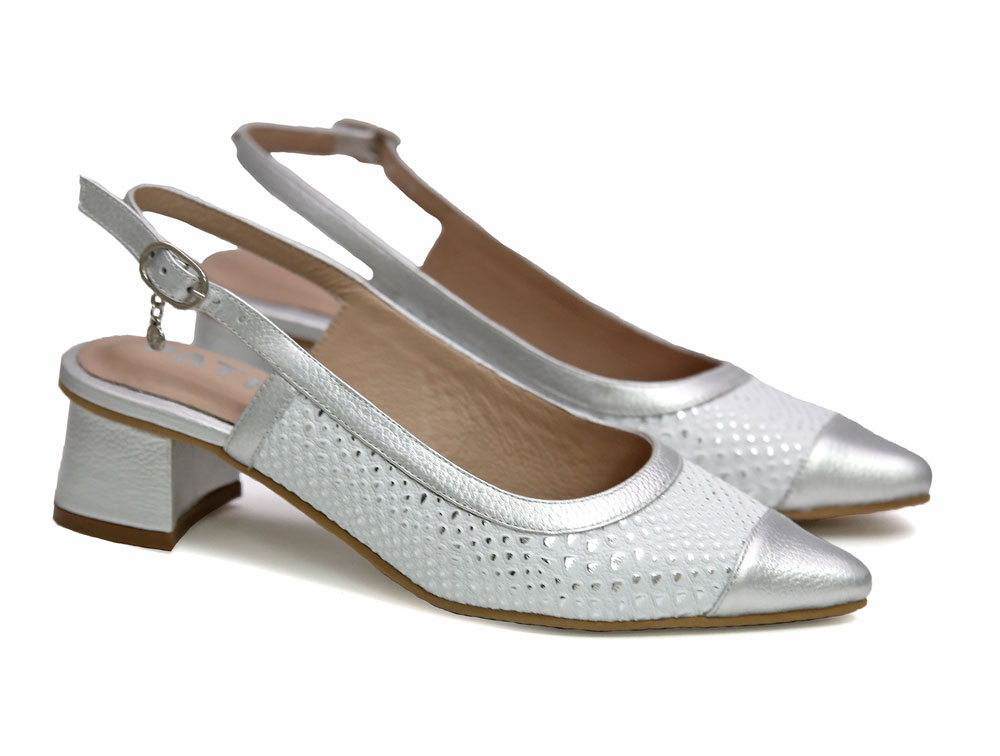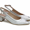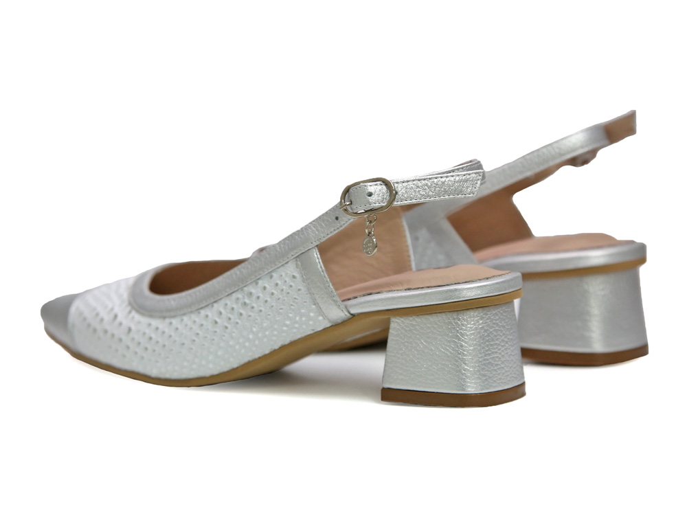 Zapatilla destalonada en cuero con acabado en folia plata, correa ajustable y hebilla cromada.