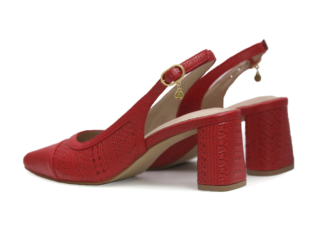 Zapatilla destalonada roja, su acabado en cuero texturizado aporta un aire moderno. Puntera fina, con correa ajustable que estilizan el pie y tacon ancho con plantilla acolchada para mayor confort. Hecho por manos colombianas. |