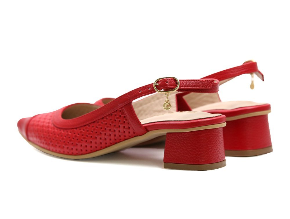 Zapatilla destalonada en cuero rojo con textura en folia, correa ajustable y hebilla cromada. Ideal para ocasiones formales o como complemento chic para un look de oficina, este modelo fusiona diseño y distinción sin renunciar a la comodidad. Hecho por manos colombianas. |