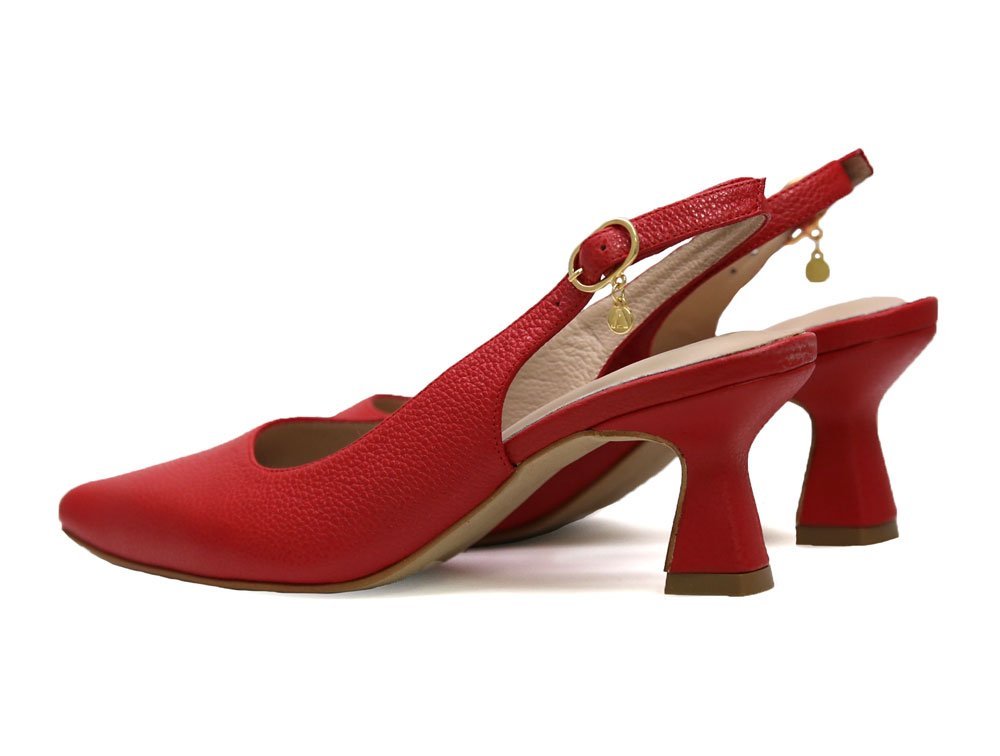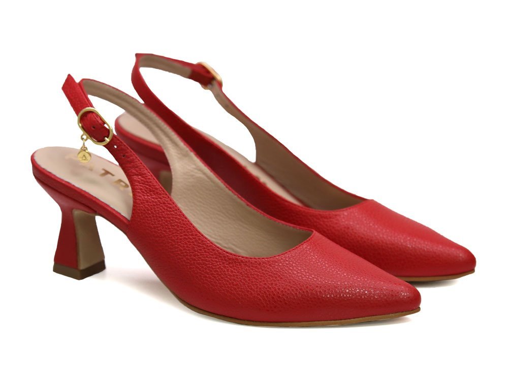 Zapatilla destalonada en cuero rojo, lo que le aporta un aspecto sofisticado y moderno. Su punta fina y correa estilizan el pie. Tacon geometrico, cómodo y versátil. Perfecto para ocasiones formales, oficina o eventos sociales.. Hecho por manos colombianas. |