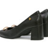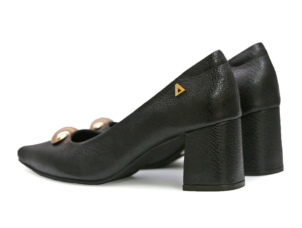 Zapatilla en cuero color negro. Su diseño clásico presenta una punta fina y un tacón grueso que aporta estabilidad y estilo. Accesorio dorado , y plantilla acolchonada. Perfectos para la oficina, reuniones o eventos elegantes. Hecho por manos colombianas. |
