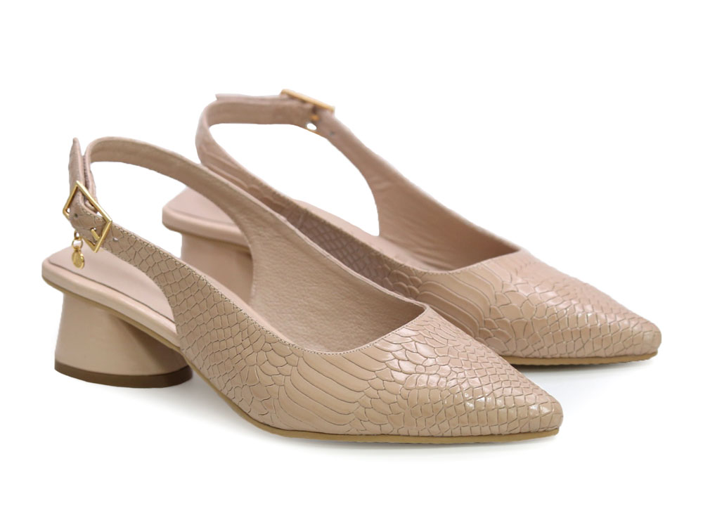 Zapatilla destalonada en cuero grabado charol, Posee correa ajustable y hebilla metálica garantizando un ajuste cómodo y seguro. Su tacón ancho con acabado, aporta un detalle moderno sin perder la sofisticación. Hecho por manos colombianas. |