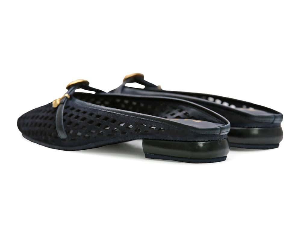 Zueco troquelado en cuero azul. Su capellada presenta un delicado acabado calado que permite mayor frescura y transpirabilidad, ideal para el uso diario. Incorpora un detalle decorativo metálico en tono dorado que aporta un toque sofisticado y distintivo. Elaborados por manos Colombianas. |