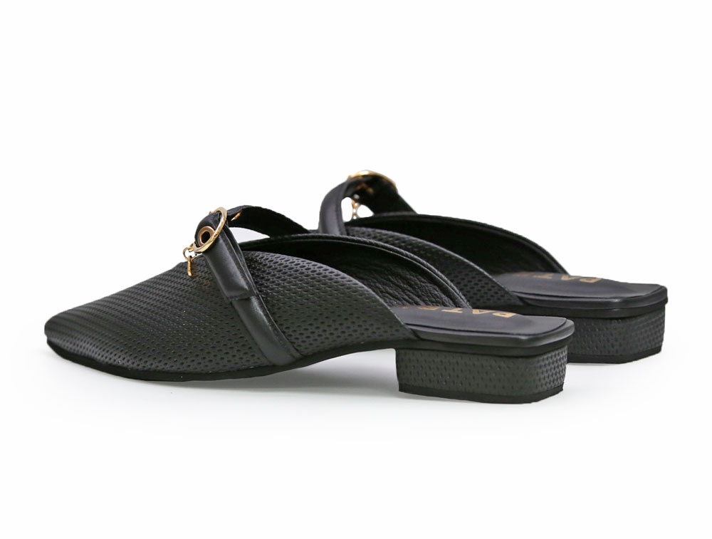 Zueco en cuero grabado color negro, de diseño elegante y minimalista. Cuenta con punta fina y detalle de correa con herraje dorado decorativo que aporta un toque sofisticado. Su plantilla acolchada brinda comodidad, mientras que el tacón bajo cuadrado lo hace ideal para usar durante todo el día. Hecho por manos colombianas.. |