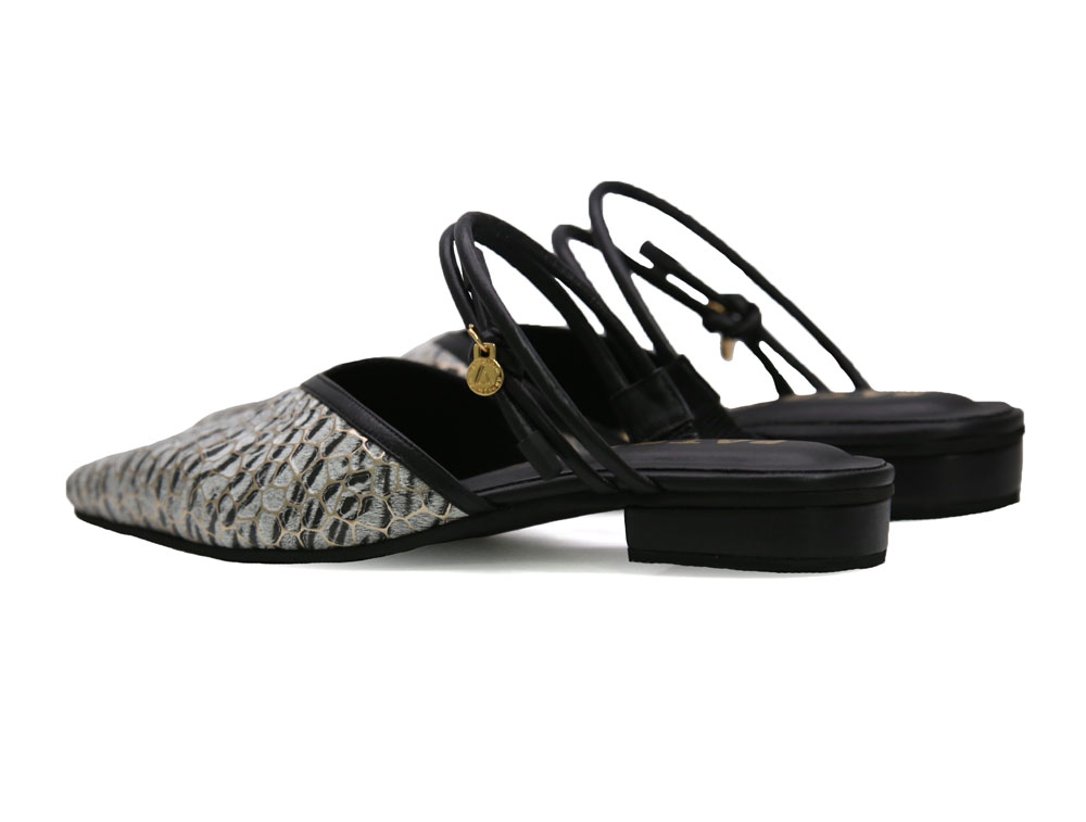 Zueco en cuero grabado. Su diseño destalonado con punta fina estiliza el pie, y las tiras traseras delgadas aportan un detalle elegante y femenino. Ideal para complementar outfits casuales, urbanos o más formales con estilo y confort. Hecho por manos colombianas.. |