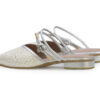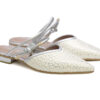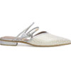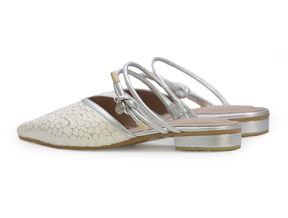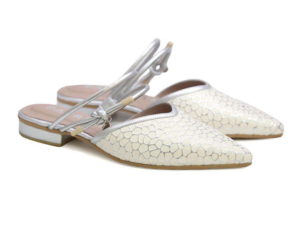 Zueco en cuero grabado. Su diseño destalonado con punta fina estiliza el pie, y las tiras traseras delgadas aportan un detalle elegante y femenino.