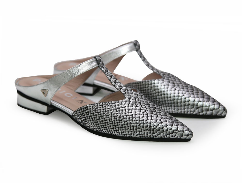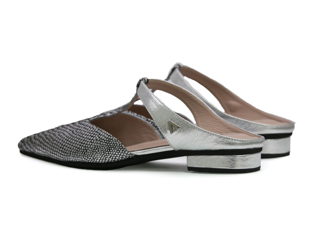 Zueco en cuero grabado con acabado metalizado en tono plata. Presenta un diseño elegante, con puntera fina y una abertura lateral que aporta ligereza visual y comodidad. Su estilo es versátil, ideal tanto para ocasiones formales como para looks de diario más cuidados. Hecho por manos colombianas.. |