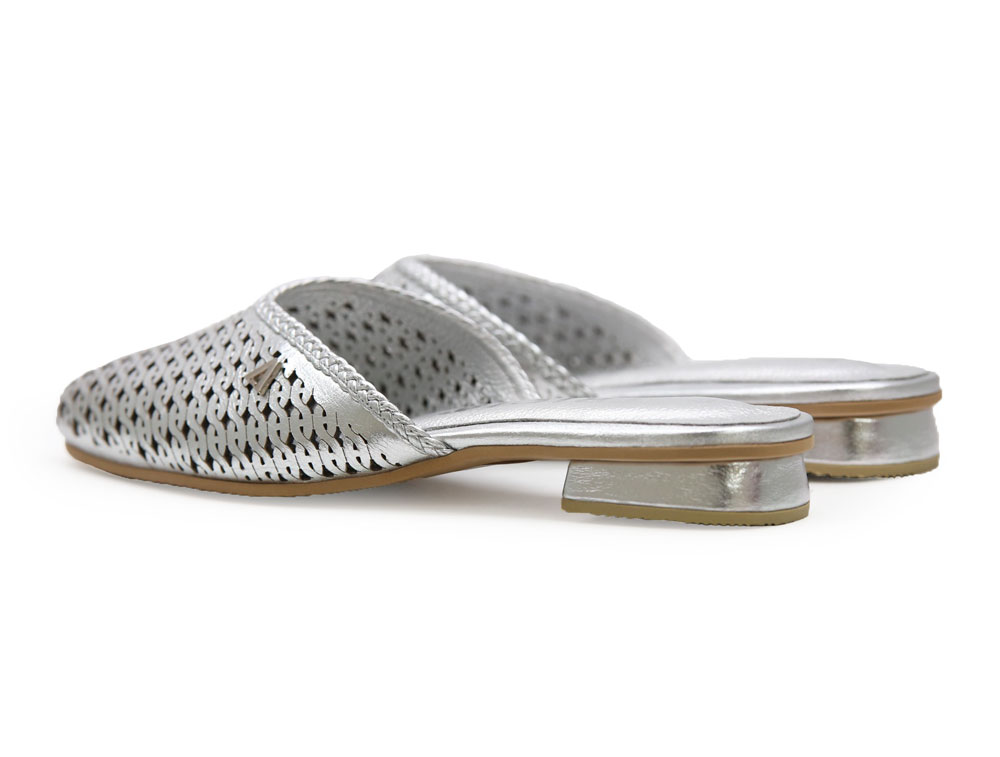 Zueco elaborado en cuero, color plata metalizado. Diseño troquelado que aporta frescura y estilo. Su diseño tipo mule facilita el calce y lo hace ideal para un look elegante y moderno. Hecho por manos colombianas.. |
